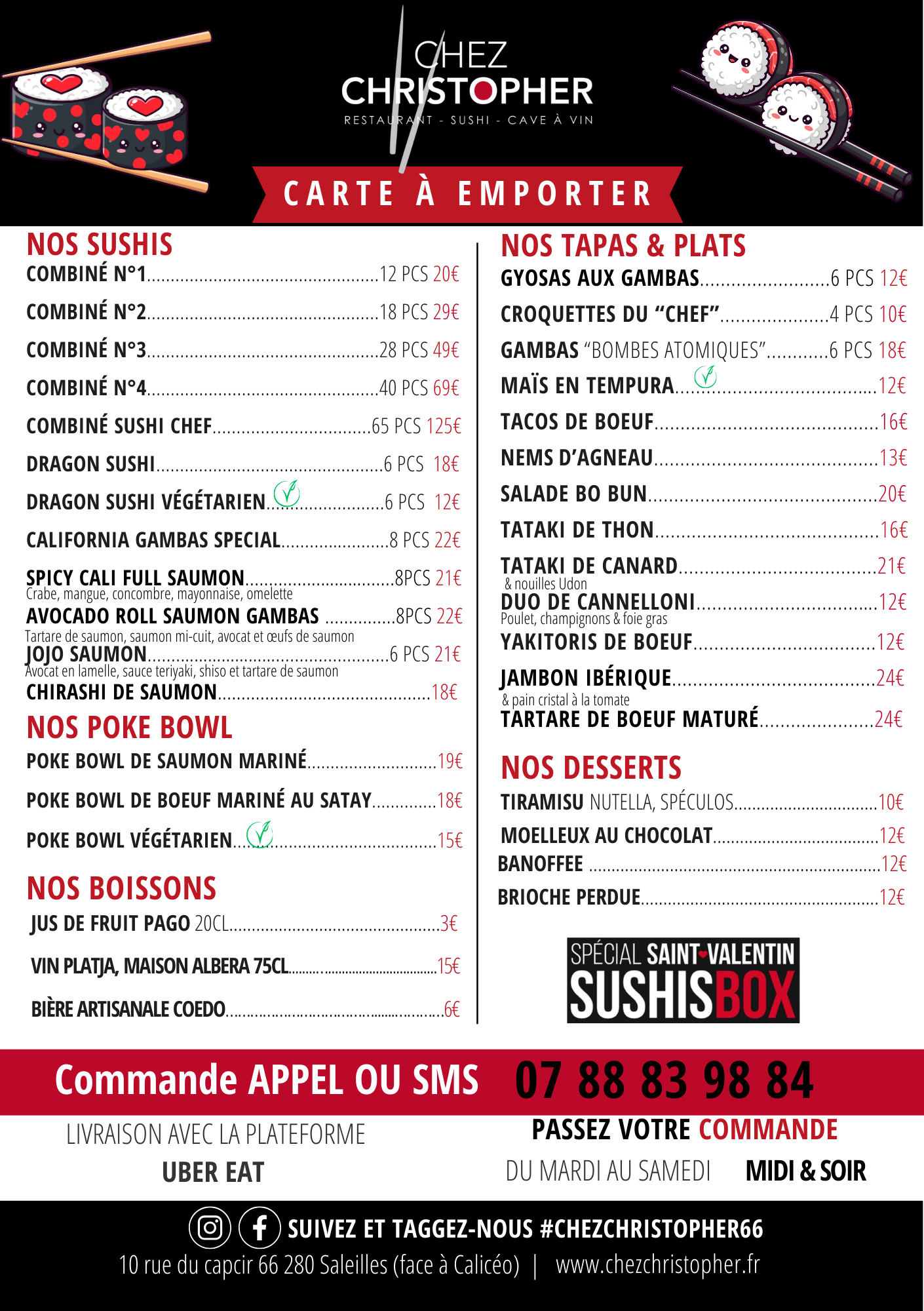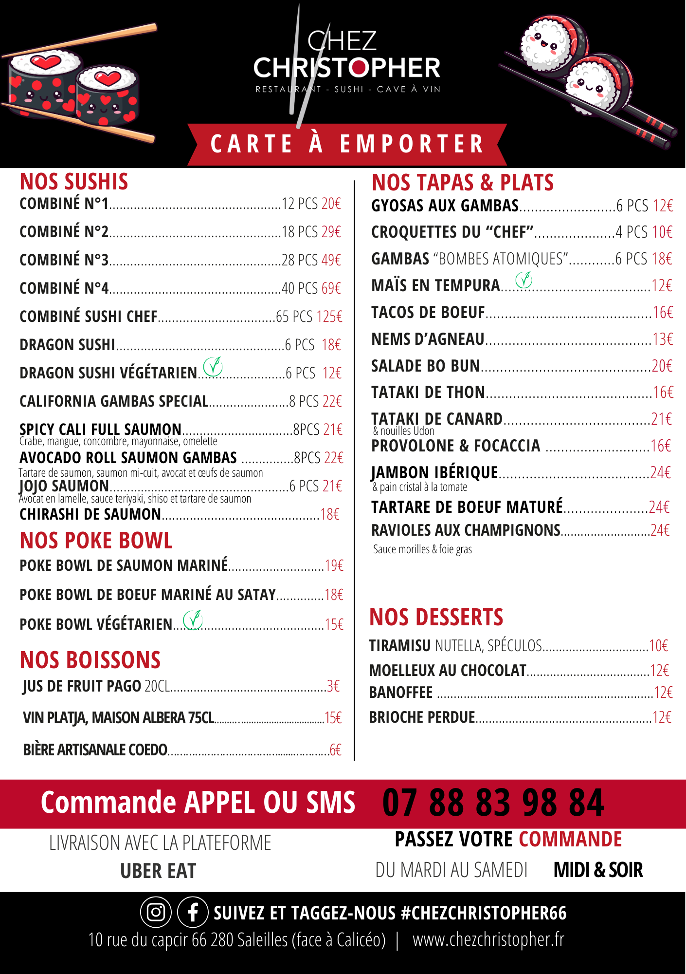 10 rue du Capcir, 66280 Saleilles Ouvert du mardi au samedi midi et soir. Fermé Dimanche et Lundi 07 88 83 98 84